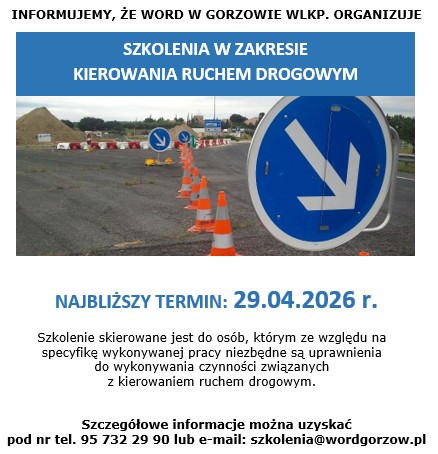 Kierowanie Ruchem Drogowym – najbliższy termin 29.04.2026 r. Administracja2026-04-21T14:30:29+02:0021 kwietnia, 2026|Aktualności| Informacje o szkoleniu w zakresie kierowania ruchem drogowym Informacje o szkoleniu w zakresie kierowania ruchem drogowym