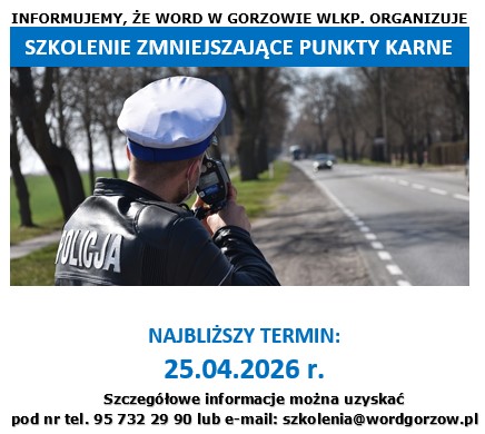 Szkolenie zmniejszające punkty karne – najbliższy termin 11.04.2026 r. Administracja2026-04-13T12:10:07+02:0013 kwietnia, 2026|Aktualności| Szkolenie realizowane jest tylko w formie stacjonarnej Zgłoszenie uczestnictwa można dokonać ONLINE, za pośrednictwem poniższego formularza.